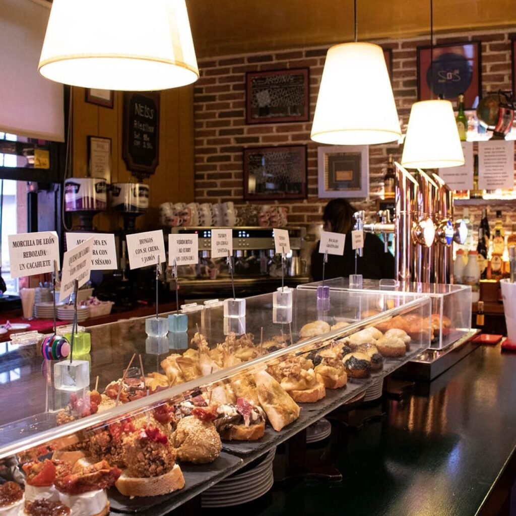 Aquí se trata de moverse, de ir de bar en bar. Lo habitual es hacer una ruta: entrar en un bar, pedir uno o dos pintxos con bebida, y seguir al siguiente. Este recorrido (el famoso “poteo”) forma parte de la experiencia y permite probar más variedad sin gastar demasiado.
