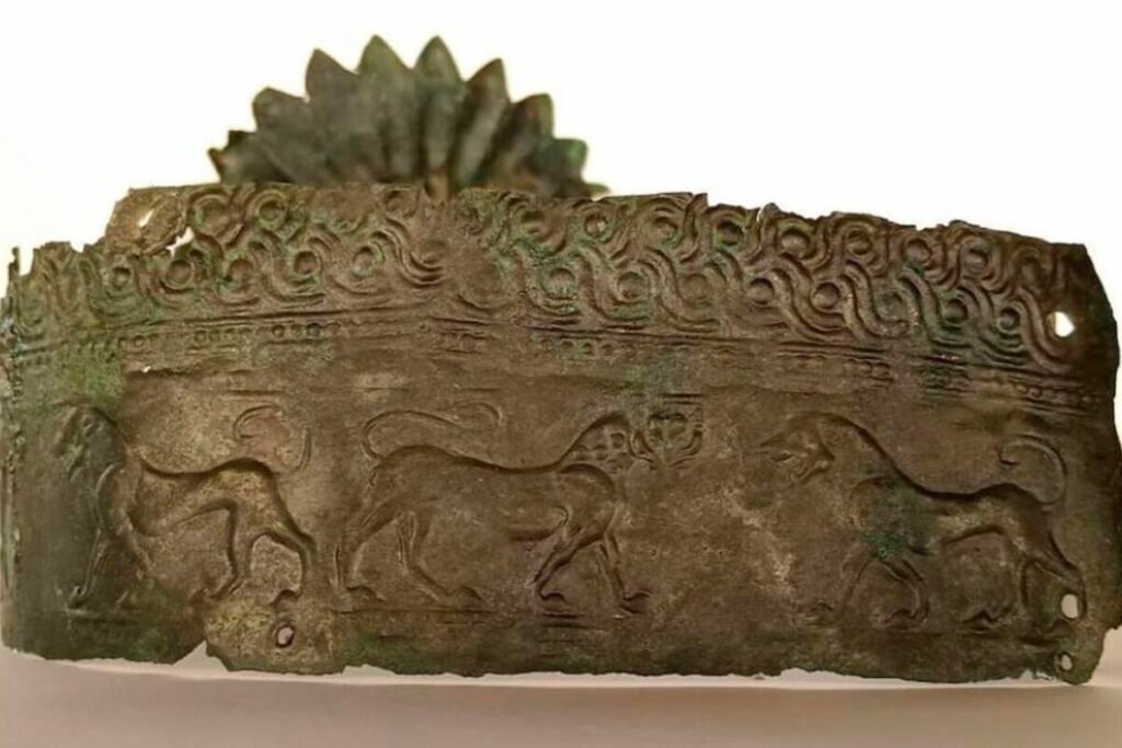 La diadema es una pieza de gran elaboración: su banda de bronce lleva un friso con pares de leones heráldicos (macho y hembra), símbolos reconocidos de autoridad en el mundo antiguo, y culmina en una roseta central con forma de sol, sugiriendo un estatus elevado, probablemente regio o aristocrático.