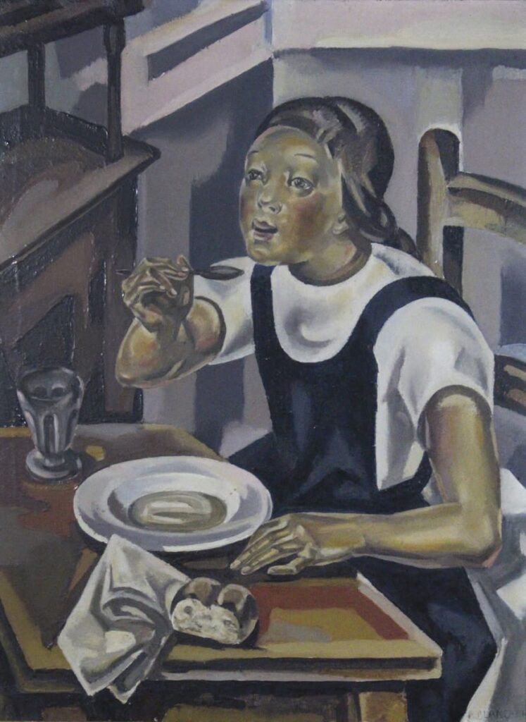 La fillette à la soupe, que data de 1924, ofrece una visión de la etapa tardía de Blanchard, en la que la artista se aleja de las composiciones más puramente cubistas (movimiento con el que estuvo vinculada durante su estancia en París) para recuperar una figuración más realista, aunque siempre con un sello personal que traduce tanto sensibilidad como profundidad en la representación de sus figuras.